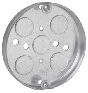 Device Boxes TP269 4 in round shallow steel ceiling pan box with knockouts, used for mounting light-duty fixtures and making branch-circuit splices.