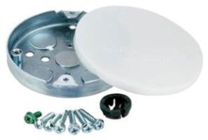 Round ceiling box rated for fan or fixture support; provides internal volume for conductors and mounting ears for devices or fan brackets.