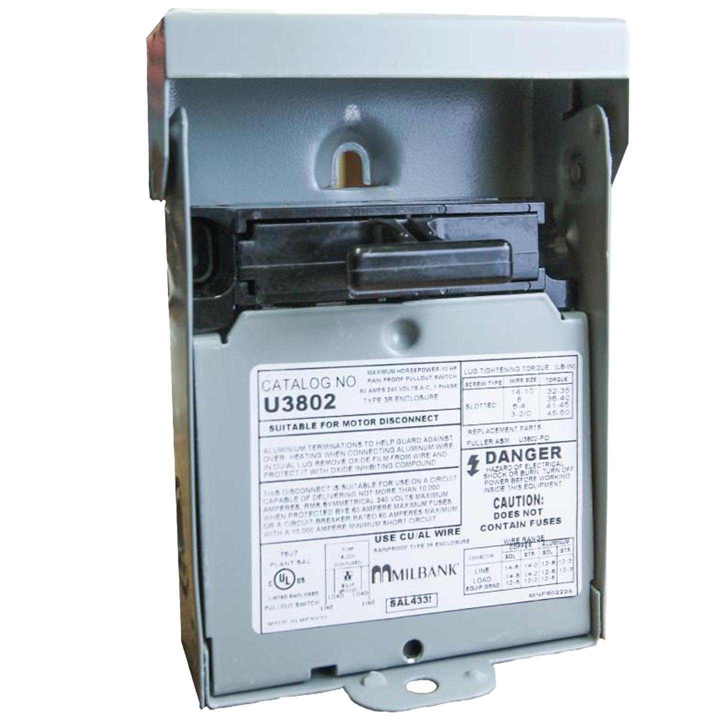 Milbank U3802 60 Amp 240 Volt non-fused pull-out air-conditioner disconnect, rain-tight enclosure for outdoor HVAC or equipment service.